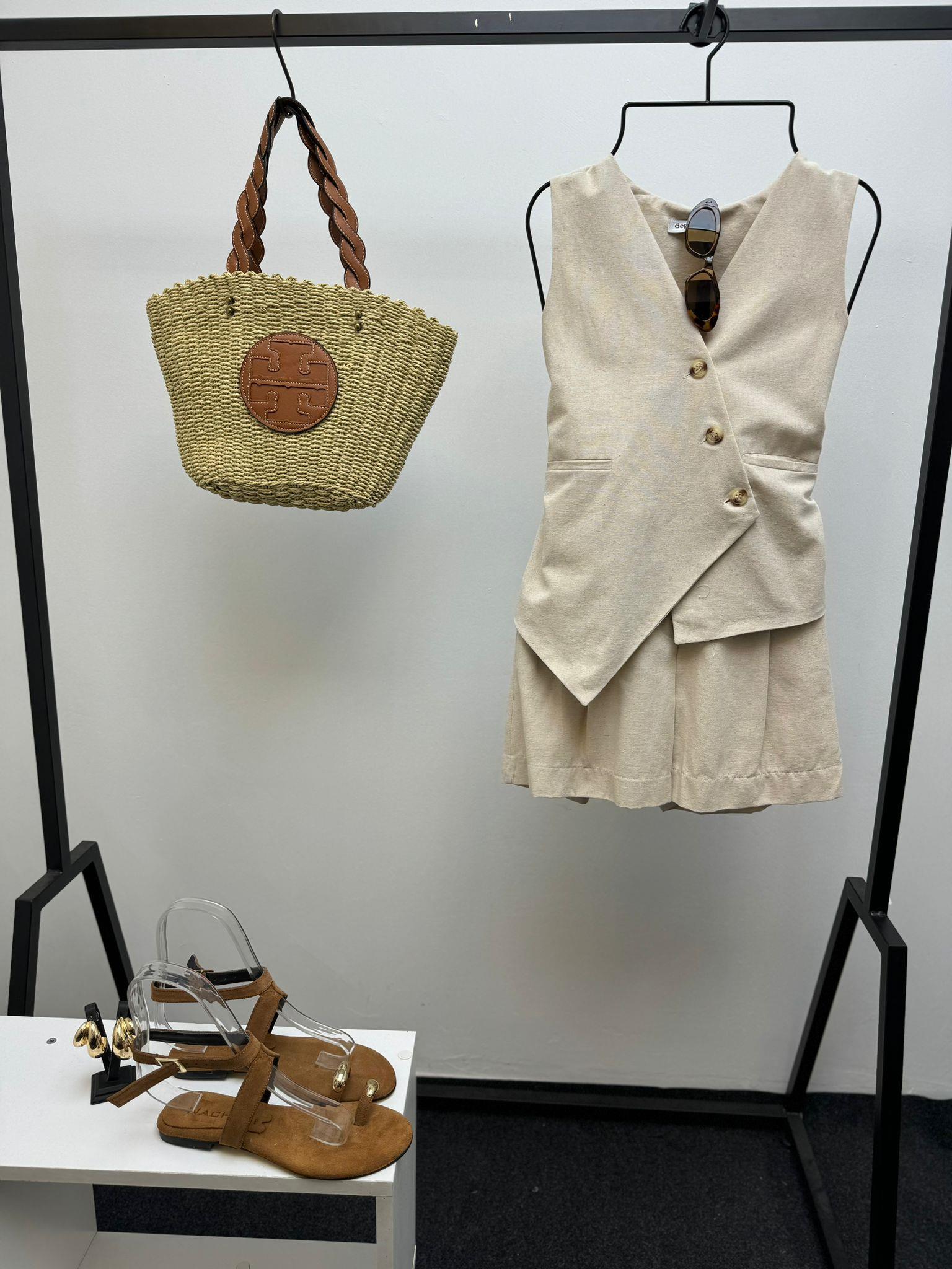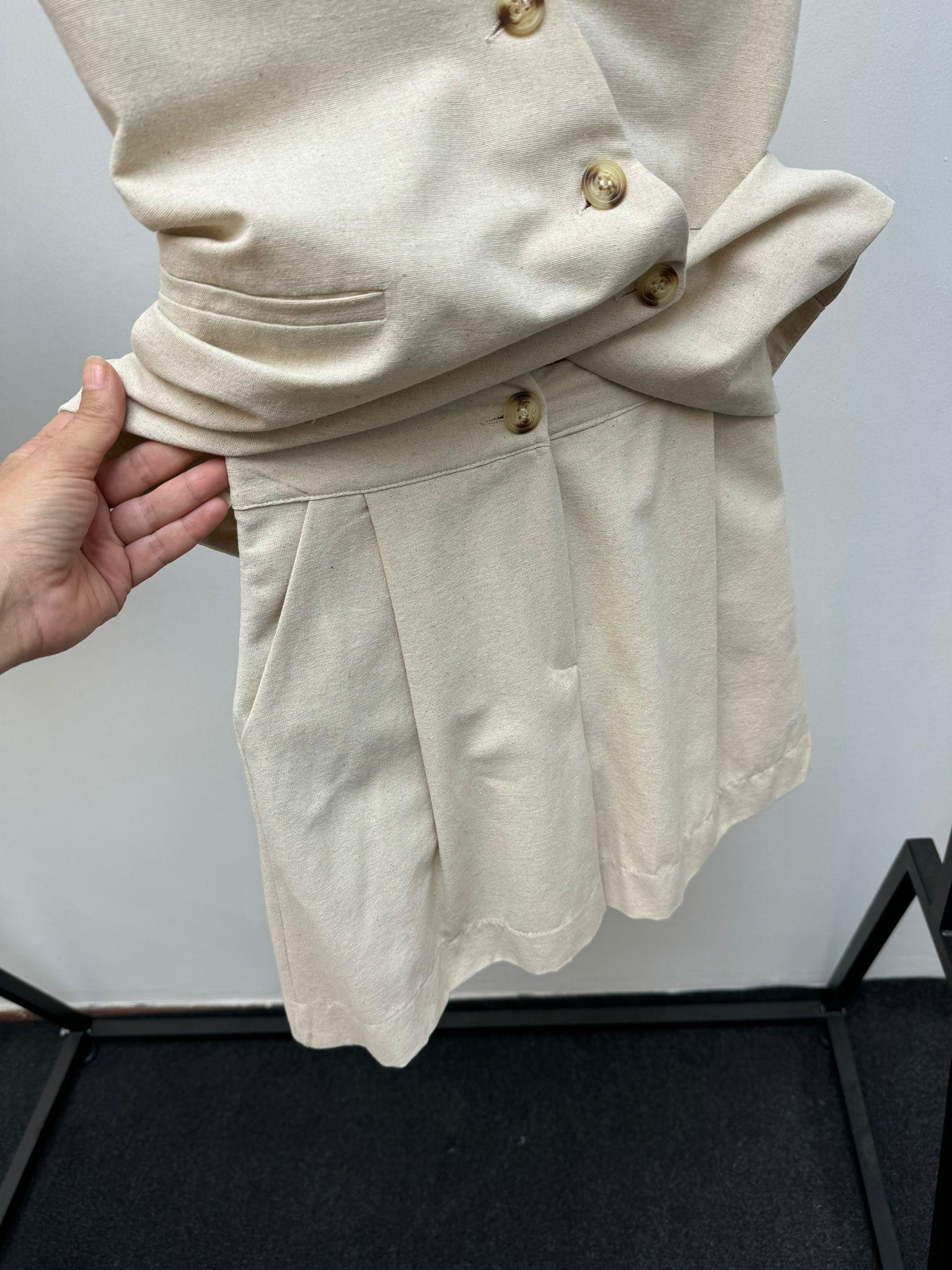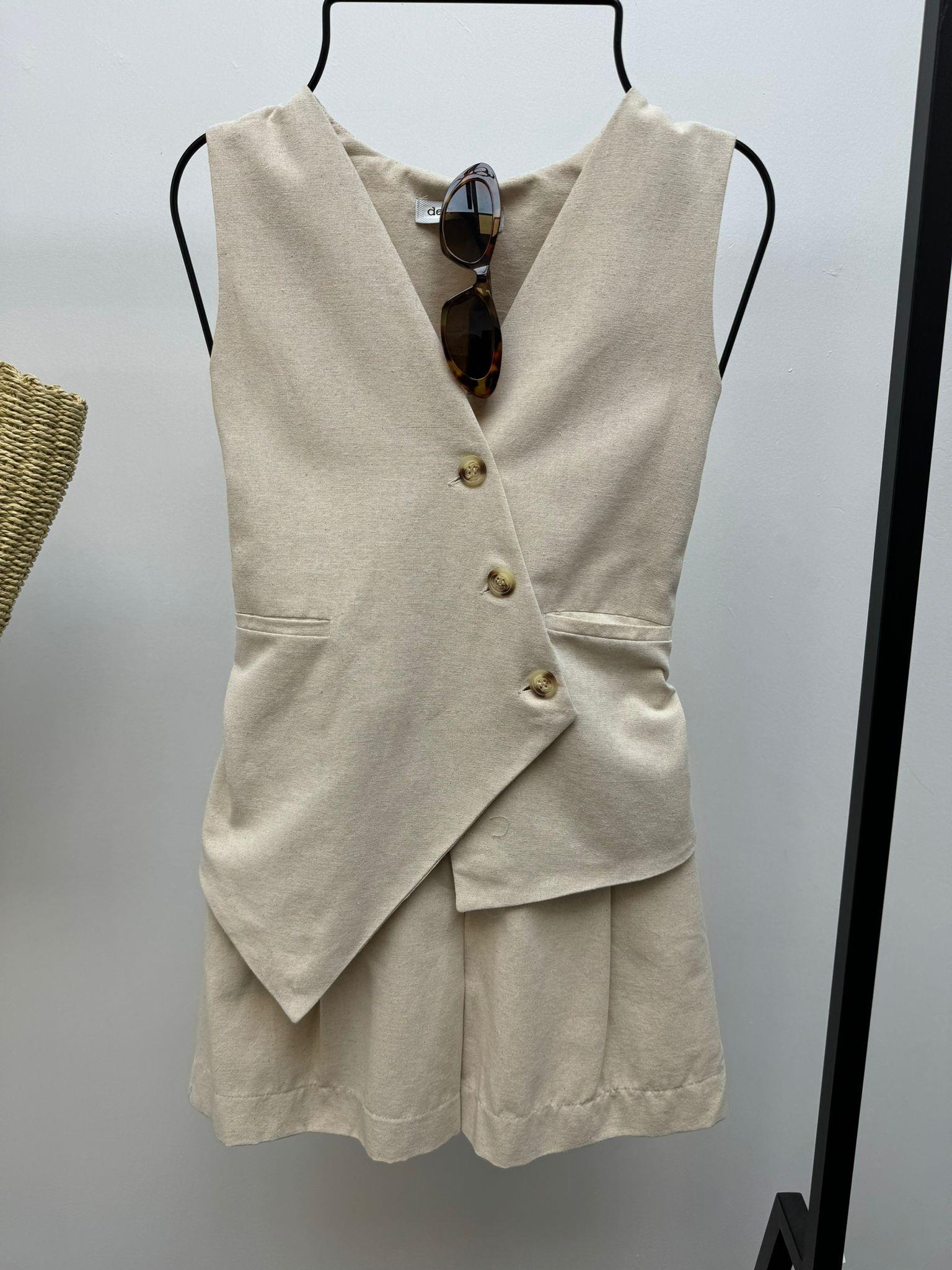 ÇAPRAZ DÜĞMELİ BEJ YELEKLİ TAKIM