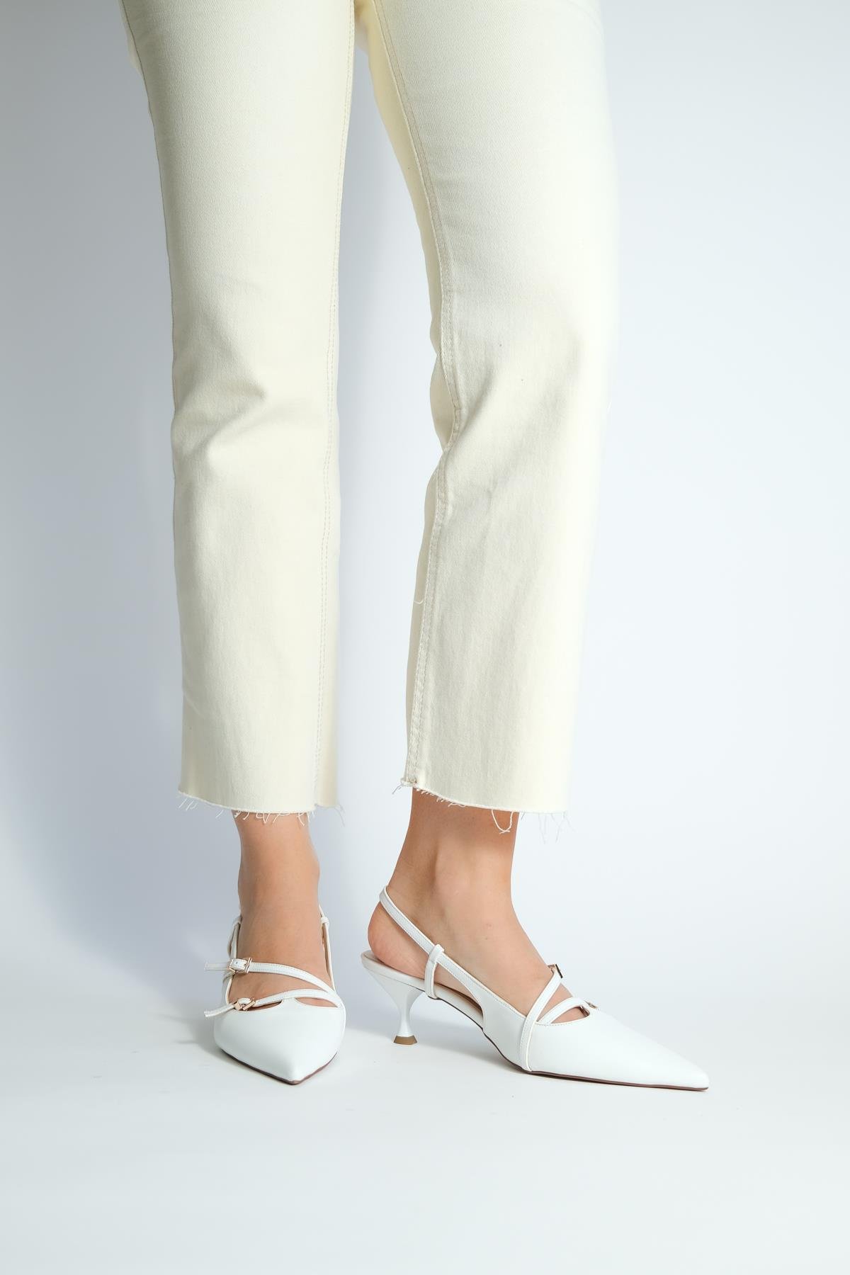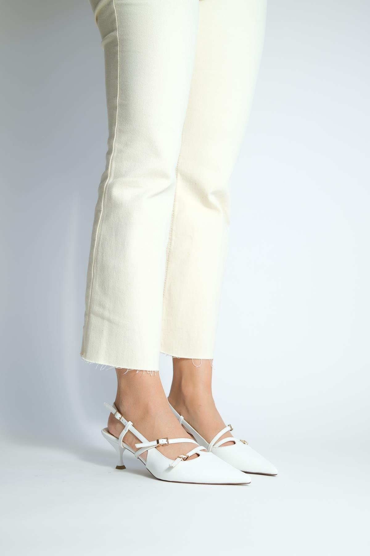 Hazel Beyaz İki Bantlı Sivri Burun Arkası Açık Topuklu Ayakkabı