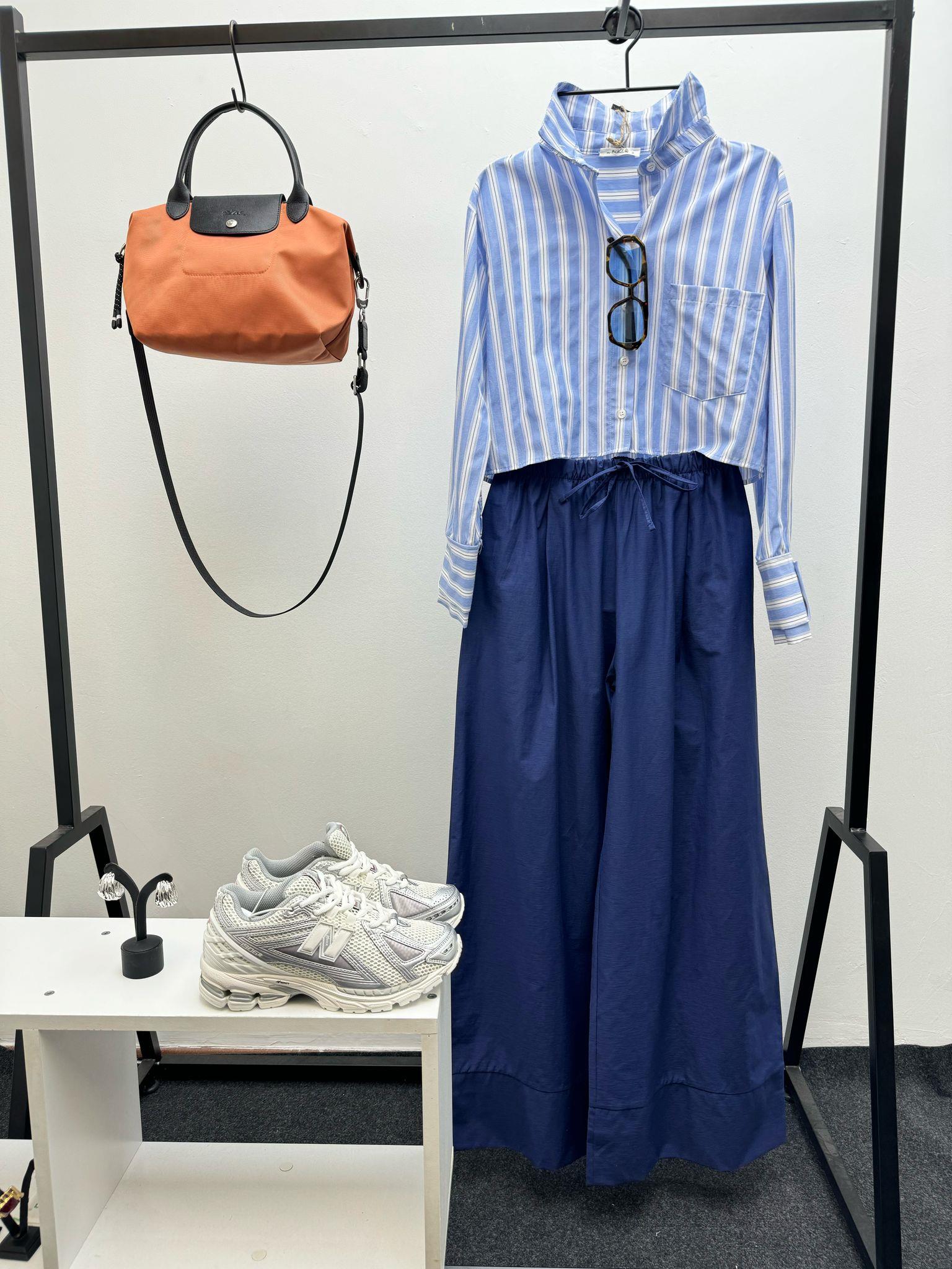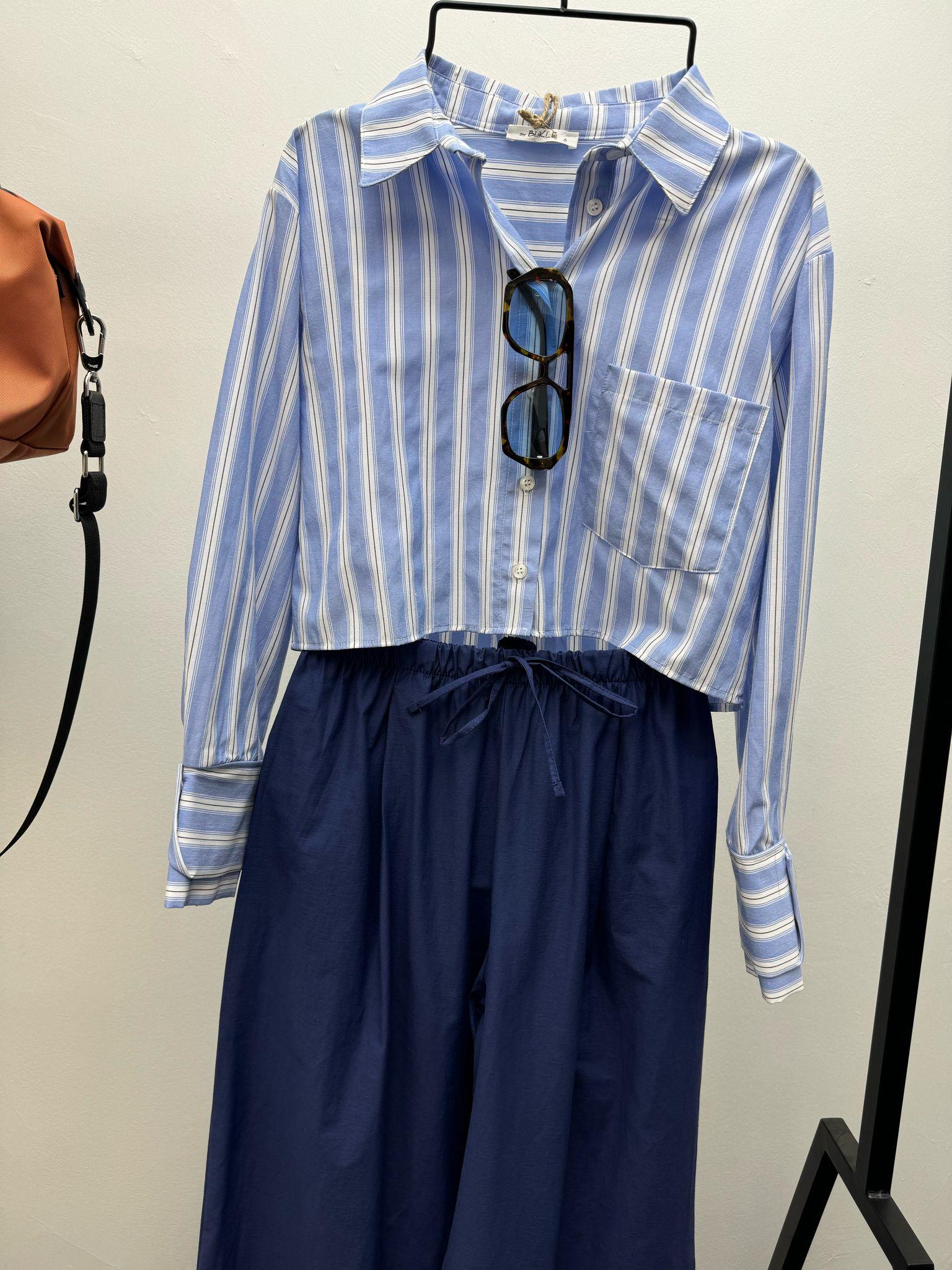 MANŞET DETAYLI ÇİZGİLİ MAVİ CROP GÖMLEK